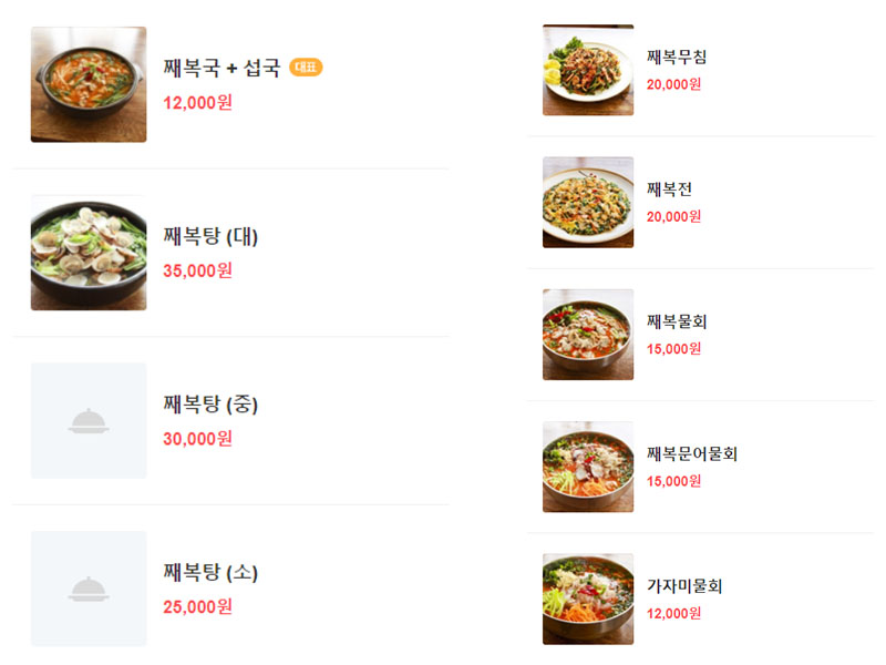 째복국+섭국: 12,000원 째복탕(대): 35,000원/ 째복탕(중): 30,000원/ 째복탕(소): 25,000원 째복무침: 20,000원/ 째복전: 20,000원 째복물회: 15,000원/ 째복문어물회: 15,000원/ 가자미물회: 12,000원 |